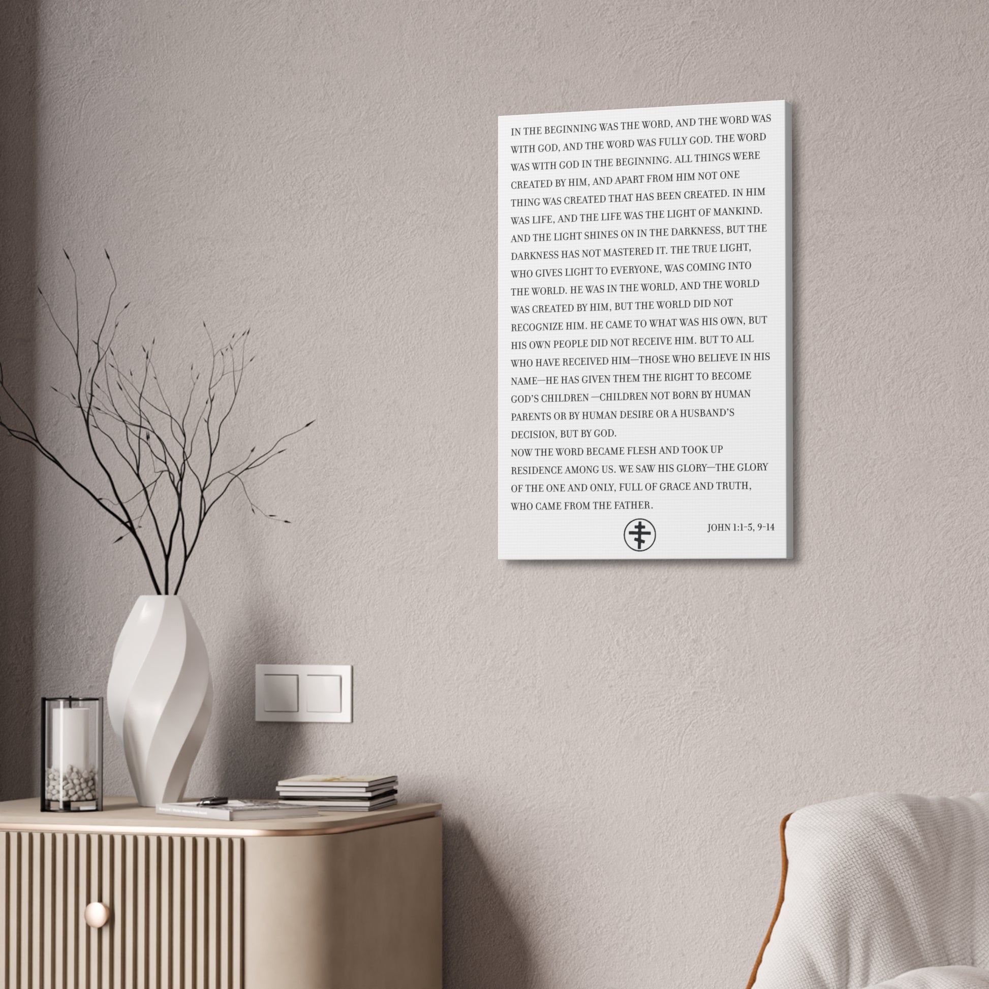 A stretched canvas that brings the opening of John — verses 1–5 and 9–14 — into your room with quiet clarity. The words sit on a crisp, semi-gloss surface that catches light gently, while rich, true-to-design ink keeps every letter and subtle detail readable from across the room. Hung above a reading chair or placed near a simple altar, this canvas reads like a prayer you can see: reflective, steady, and made to be part of daily rhythm. The pinewood stretcher gives the piece a warm, natural edge that pairs well with wooden shelves or farmhouse-style décor. A small QR code on the back connects you to additional resources, while included mounting hardware makes it easy to place the canvas where it will be seen and returned to often.